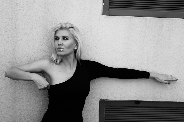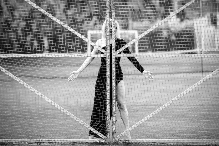 Серия называется «Катя вышла в платье». Снимали в каком-то парке. Катя была артистична и бесстрашна. Прохожие реагировали оживлённо. Получилось всё как я люблю: классическая фотография, чб и геометрия.