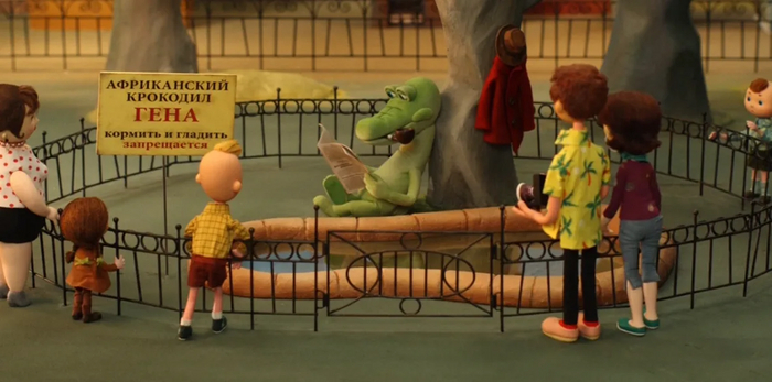 Крокодил работает в вольере, который больше похож на парк с прудом и деревом. В Московском зоопарке еще в 1920-е годы решили заменить клетки для животных на живописные вольеры с более подходящими условиями для животных. Учитывая то, что Чебурашку не приняли в зоопарке, где звери «живут в гармонии» (метафора демонстрации превосходства идеологии социализма над капитализмом) Качанов и Шварцман дали ясно понять, что в случае главного героя мультфильма, несмотря на открытость социалистов к этническому разнообразию (СССР, как известно, страна многонациональная), некоторые «тропические» герои не допускаются даже на порог.