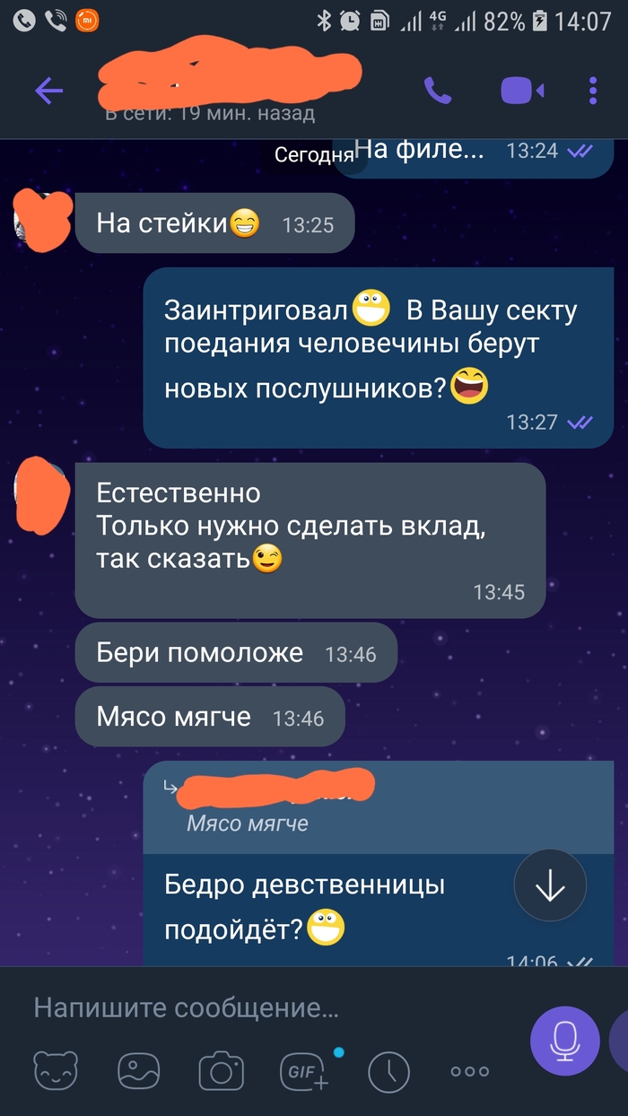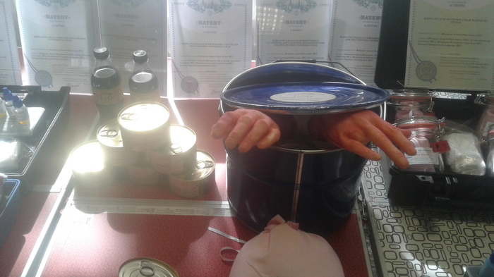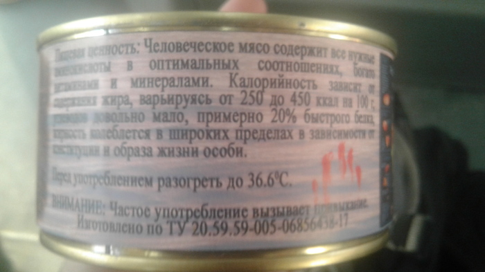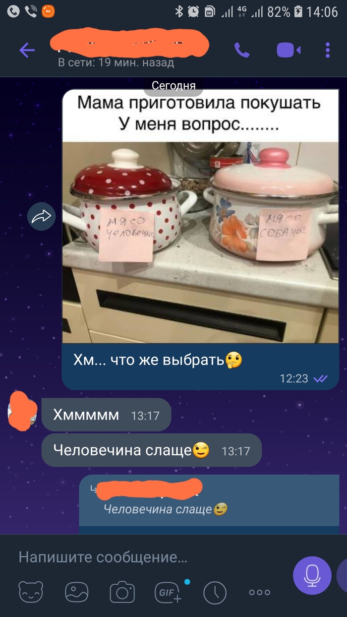 Попалась на пикабу фотка двух кастрюлек с человечиной и собачатиной. Улыбнуло, скинул другу. Человек он с юмором надо признать...