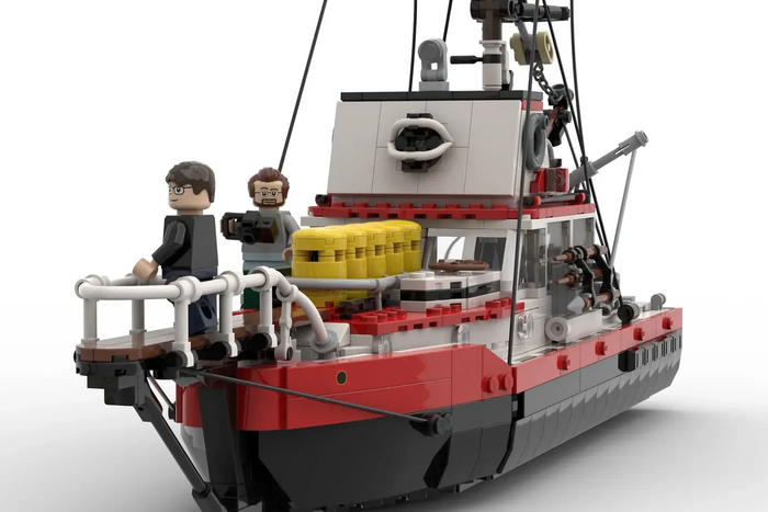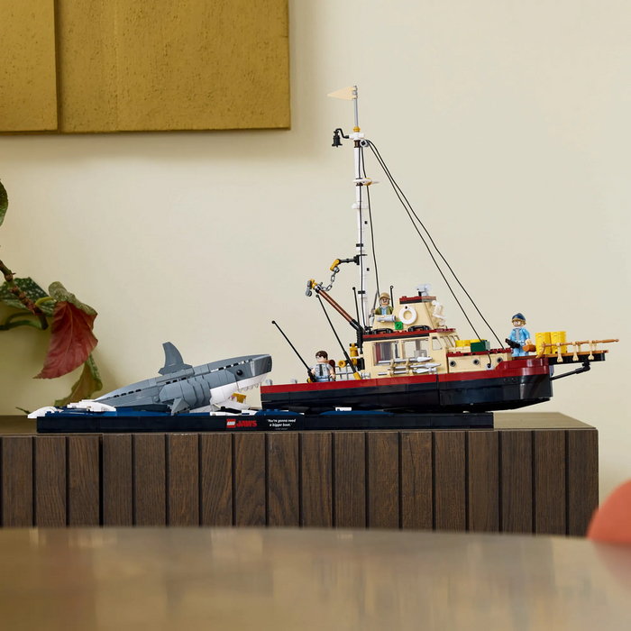 В набор из 1497 деталей входят лодка (Orca), акула, минифигурки Мартина Броуди, Мэтта Хупера и Сэма Квинта, а также ключевые предметы их охоты, такие как гарпун и желтые бочки.