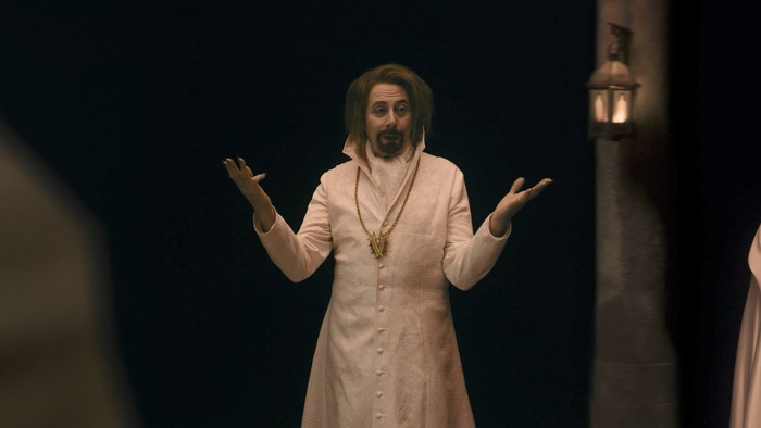 И хочу сказать, что весь этот суд впечатлил меня куда сильнее, чем встреча Геркулеса и Аладдина. Всё-таки затащить в проект Тильду Суинтон, Дэнни Трехо, Уэсли Снайпса (пусть и по видеосвязи) и ещё несколько актёров из разных вампирских фильмов и сериалов, логично и обоснованно свести персонажей вместе и тщательно воссоздать их оригинальные образы, да ещё и парочку удачных отсылок оставить — для средненького сериала задача не из лёгких. Но с ней справились.