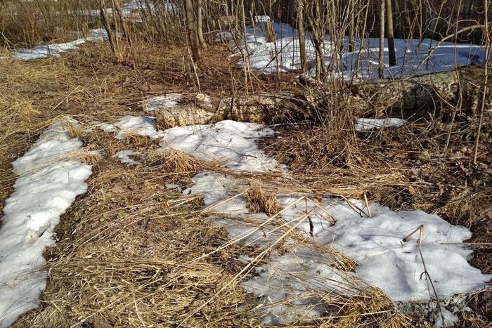 Если вы смотрите эту запись в какое-то другое время года, трудно представить, как выглядит природа в конце апреля. Вот вам снимок, чтобы понять: прошлогодняя пожухлая трава уже освободилась от сугробов, но в каждой ямке или канаве еще лежит белый снег.