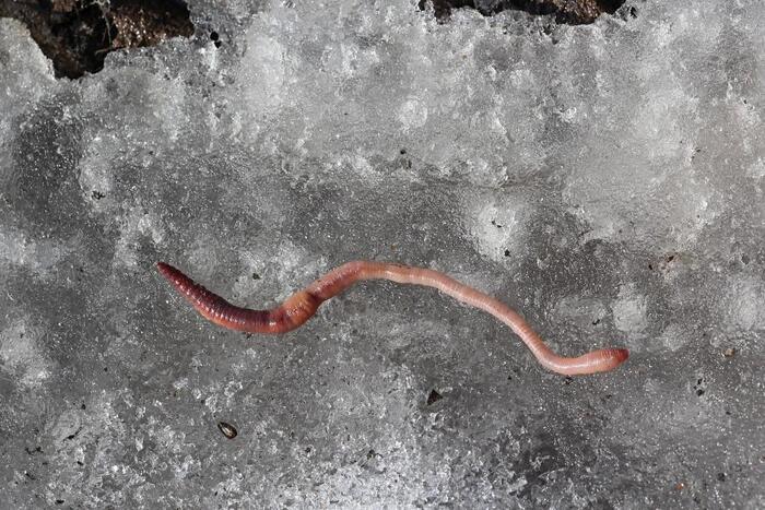 Очень удивил земляной червяк (лат. Lumbricina), выползший на не до конца растаявший лёд. Это не я его туда положил, я его прямо там и нашел, на поверхности льда в дорожной колее. Видимо, отогретый в растаявшей земле переползал на новое место, где теплее и можно найти пищу.