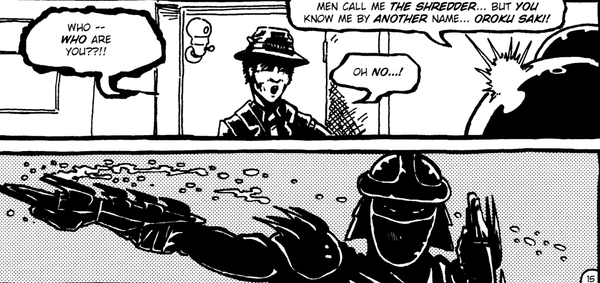 К чему же Сплинтер ведёт? Ах да. Теперь Черепашки доказали, что они – не жалкие букашки. Теперь они готовы сделать то, для чего Сплинтер их тренировал – найти и убить Шредера – и всех, кто встанет у них на пути. Итак – операция начинается. Пробравшись на базу Ноги и убив нескольких охранников, Рафаэль бросает Шредеру вызов – «ПвП или зассал?». Заодно срывает крупную сделку Шредера с какой-то важной подпольной организацией Нью-Йорка. Ороку Саки в бешенстве! Он принимает вызов – хоть и недоумевает, почему неизвестный вызывающий так протормозил с вызовом – убийство Хамато Йоши состоялось 15 лет назад.