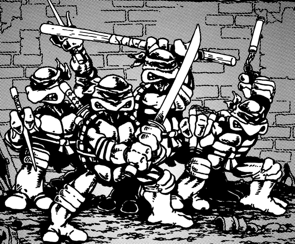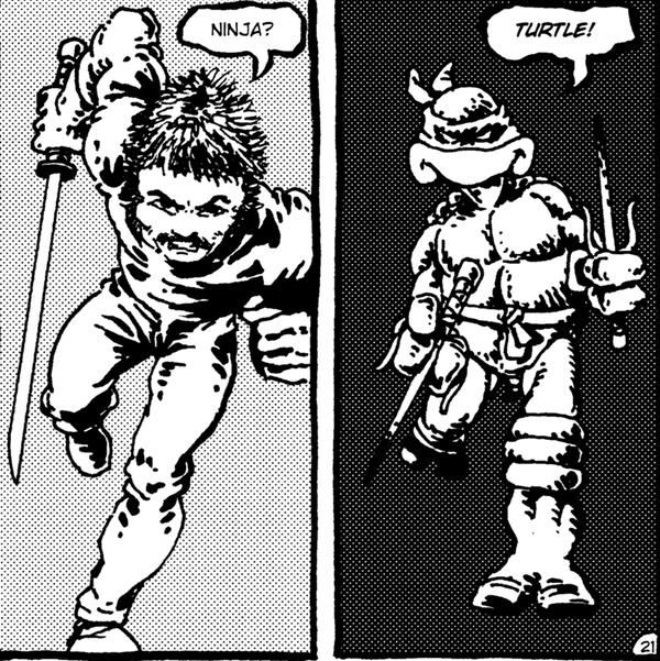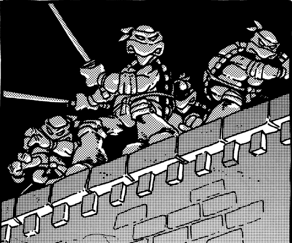 Комикс начинается с того, что Черепашки готовы навставлять брутальных люлей банде Пурпурного Дракона. В качестве своего рода экзамена. «Драконов» пятнадцать, у всех оружие, у многих огнестрельное. Черепашек всего четверо, у всех оружие холодное – но они, в отличие от своих аналогов из мультиков, не постесняются его применить. Нунчаками выбиваются зубы и ломаются бандитские кости, а саи и катаны обагряют асфальт бандитской кровью. Пара минут – и экзамен сдан. Черепахи, как настоящие ниндзя, исчезают в тенях (точнее, в канализации) до прибытия полиции.