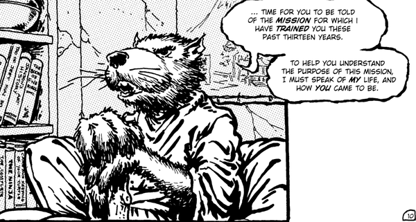 Сплинтер, престарелый крыс, хвалит учеников и обещает рассказать им, для чего он их тренировал – но для лучшего понимания их миссии им необходимо узнать его полную историю. А был Сплинтер обычной крысой, питомцем ниндзя по имени Хамато Йоши, сильнейшего воина тени из клана Ноги. Видя, как его хозяин тренируется, Сплинтер начал повторять его движения – и вскоре и сам стал неплохим ниндзя. Ну, по меркам крысы. Так вот, был у Хамато Йоши враг в клане – Ороку Наги. Йоши и Наги соперничали за сердце очаровательной девушки, Тань Шэн. Но она любила только Йоши. Возревновав, Наги решил – «Так не доставайся ж ты никому!».