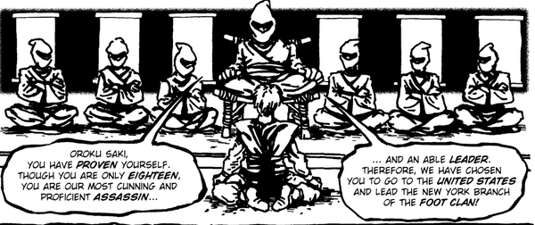 Под руководством Саки клан Ноги занялся преступной деятельностью – в частности, торговлей наркотиками и оружием, а также заказными убийствами. Сам Саки прозвался «Шредером» из-за своей безжалостности (англ. Shred – рвать, резать на лоскуты, шматовать, аррргх!). Он выследил Хамато Йоши и Тань Шэн – и убил их. Сплинтер сбежал и некоторое время вёл жизнь обычной уличной крыски. Но однажды произошло нечто необычное (ок, более необычное, чем обычно). Неизвестный парнишка вытолкнул старого слепца из-под колёс потерявшего управление грузовика с химикатами. Ему в лицо плеснуло химией (наверняка станет адвокатом, когда вырастет). Хрупкий сосуд с химикатами выскочил из грузовика, выбил из рук у другого парнишки аквариум с четырьмя черепашками и укатился в канализацию вместе с аквариумом. Сплинтеру стало жаль малышей, и он решил их спасти.
