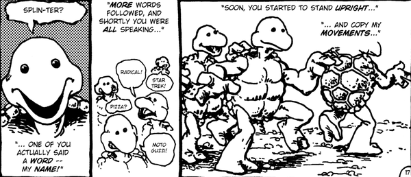 Черепашки все оказались перемазаны химикатами, и пока Сплинтер их очищал – тоже перемазался. И вот те на – вскоре малыши начали расти. Да не спокойно-медленно, как нормальные черепахи, а в ускоренном темпе – за год они достигли почти человеческого роста! И поумнели. Говорить начали. Стали повторять за Сплинтером его движения. Да и сам Сплинтер подрос, поумнел (хотя и так был неглупым) и «очеловечился». Он обучил Черепашек кодексу воина, боевым искусствам и мастерству обращения с оружием. Найдя в канализации выброшенную кем-то книгу об искусстве, Сплинтер дал черепашкам имена – Леонардо, Микеланджело, Донателло и Рафаэль. И оружие тоже дал. Откуда он взял шест бо, пару нунчак, пару сай и пару катан – не раскрывается. Чего только люди не смывают в унитаз!