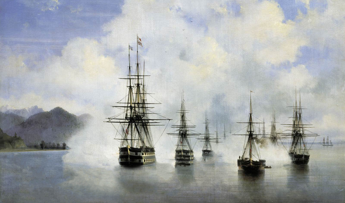 Русская эскадра прикрывала марш, продвигаясь вдоль берега. Корабли велись на буксире пароходами, оставаясь на расстоянии половины пушечного выстрела от берега. На второй день враг проявил еще больше энергии, стараясь заманить русских в горы.