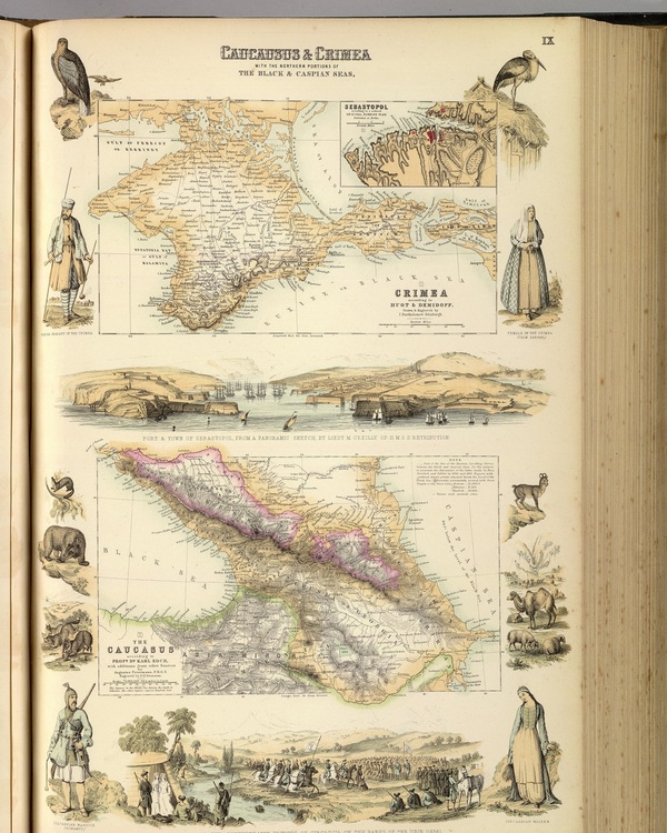 Как вы можете видеть на верхней иллюстрации под картой Крыма изображен вид на порт и бухту Севастополя. А вот под картой Кавказа изображены какие-то всадники. Но это не просто всадники - это т.н. встреча Черкесских князей в 1836 году где черкесы объявили о своей независимости. И наши "британские партнеры" не могли не запечатлеть этот момент на своих картах России. Видимо для них это главное событие на Кавказе в начале XIX века. Так что века идут - ничего у "партнеров" не меняется. Подробнее об этом "эпичном" событии вот здесь: http://circasvoices.блогспот.ru/2014/09/1836-momentous-year-...