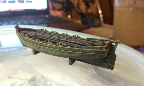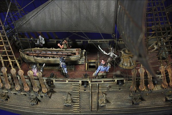 Далее была установлена девица с птичкой на нос корабля, а так же расписана подставка. Закончены палубы: разделены проливкой доски на них, прорисованы поручни, лестницы и прочие части палубы. Установлены пушки и шлюпка.