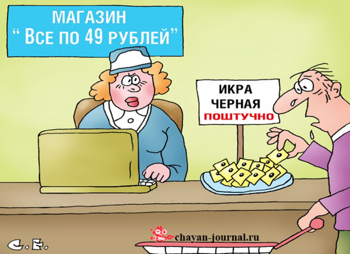 "Дотошный иностранный корреспондент пристает к директору советского гастронома: "А почему у вас черной икры на прилавках нет?" — "Не пользуется спросом у населения,— нашелся завмаг.— Вы постойте и послушайте, попросит ли хоть один человек у продавца черную икру". Корреспондент постоял час и убедился, что черная икра в СССР спросом не пользуется".