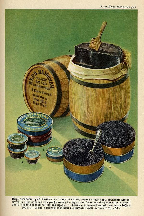 Чёрная икра, между прочим, бывала в СССР белужья, севрюжья и просто осетровая. Вид чёрной икры можно было определить по крышечкам банок: если она синяя🔵, то внутри банки — икра белуги, если жёлтая🟡 — икра осетра, если красная🔴 — икра севрюги. Социализм любил всё аккуратно раскладывать по полочкам! :) Больше всего ценилась икра белуги, так как она самая крупная — икринки до 3,5 мм в диаметре. У осетра поменьше — до 2 мм, а самая мелкая чёрная икра у севрюги — до 1 мм.
