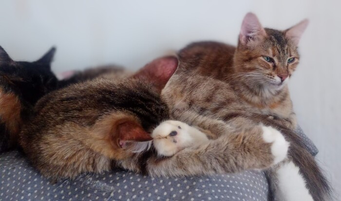 Сейчас Ежевика на передержке. Ей 1-1,5 года, она стерилизована, вакцинирована и здорова (бывший ринотрахеит давно позади). Лоточек на отлично. Первое время она боялась всего — людей, рук, даже добрых слов. Но потихоньку страхи начали таять. Теперь она уже сама тянется за лаской , мурчит и, кажется, начинает верить, что человек может быть другом.