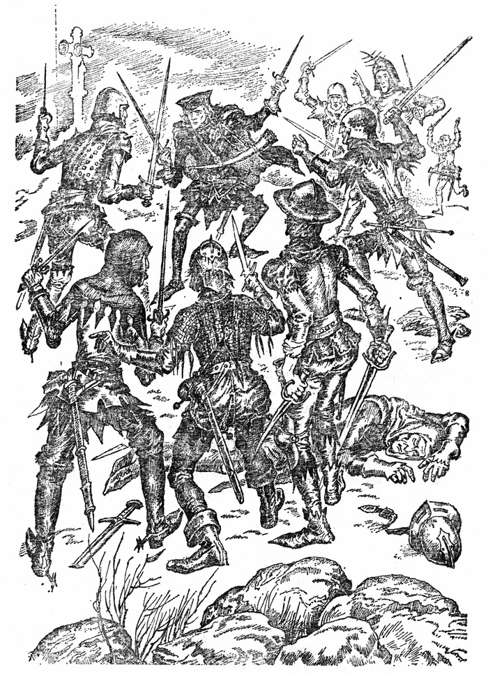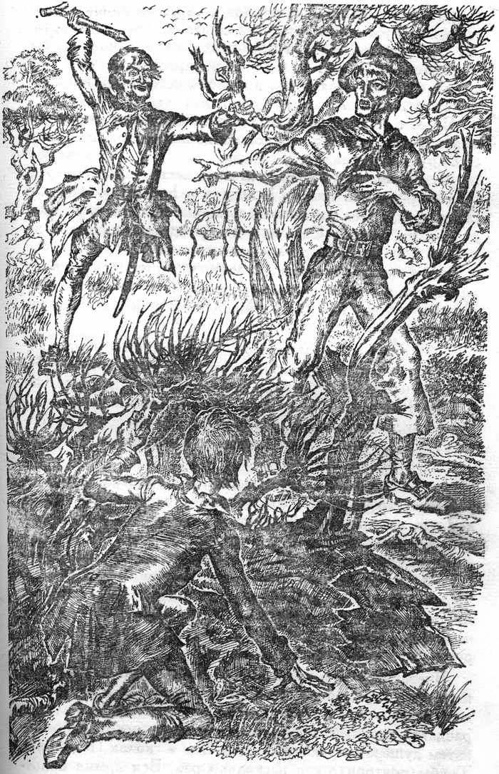 "Он увидел крест; на дороге перед крестом происходила яростная схватка. Нападающих было человек семь пли восемь, а защищался только один; но он защищался так проворно и ловко, так отчаянно кидался на своих противников, так искусно держался на льду, что, прежде чем Дик подоспел, он уже убил одного и ранил другого, а остальные нападавшие отступали."