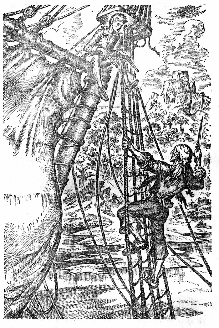 "С этими словами отважный моряк повернулся к повару спиной и зашагал к берегу. Но ему не удалось уйти далеко: Джон вскрикнул, схватился за ветку дерева, выхватил свой костыль из-под мышки и метнул вслед тому, как копье."