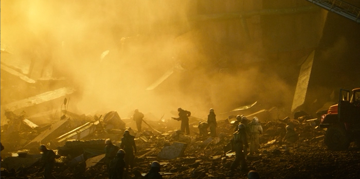 Эти две смотрят, как на них капает сверху вода. Молодцы сценаристы, ничего не скажешь. Они сняли ахинею, а разбирать это должен я. Действие приключается на пожарных, которые тушат пожар. К одному пожарному подходит другой и говорит, что с периметром они сделали все, надо пробираться на крышу. У некоторых из пожарных уже есть симптомы заражения радиацией.