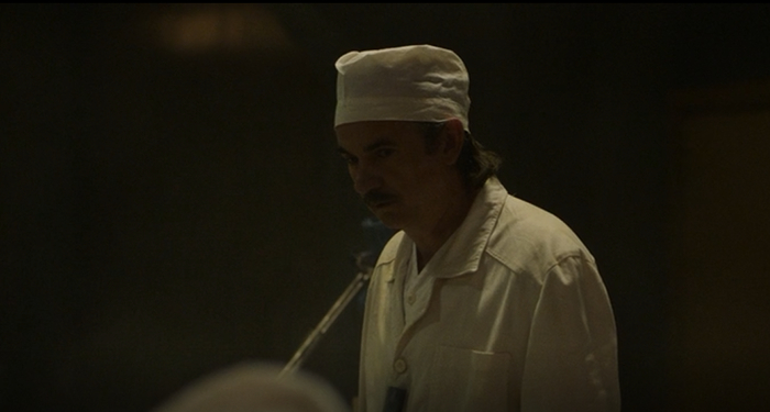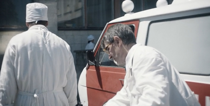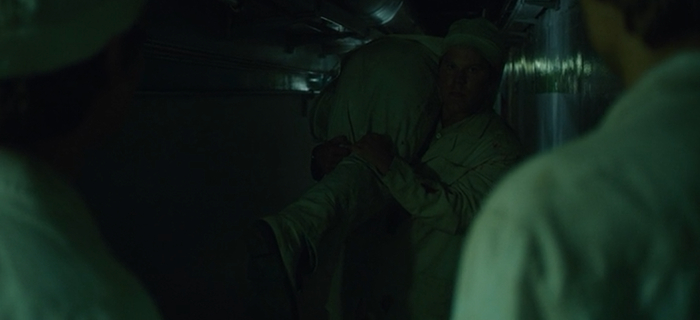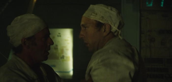 Нам опять показывают Дятлова, которой все еще не верит, что взорвался именно ректор. В зал забегает Проскуряков, которого тут же начинает рвать, и он говорит что Кудрявцев погиб. Дятлов приказывает Акимову, вызвать на станцию персонал других смен, а тот сначала отказывается, но затем под воздействием угроз Дятлова отступает. Не было и не могло такой ситуации, потому, что вызов персонала других смен в случае аварии такого уровня – совершенно стандартное действие на любой станции. Это и понятно. Предстоит колоссальная работа, каждый человек с должными знаниями и навыками на счету, а имеющиеся люди стремительно выбывают из строя: усталость, стресс, радиация… Однако авторы фильма стараются выдать эту совершенно необходимую меру, за очередной акт людоедского самодурства Дятлова, вредность которой Акимов понимает, но оказывается вынужден подчиниться из страха за собственную шкуру.