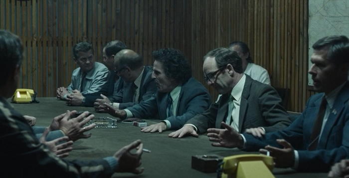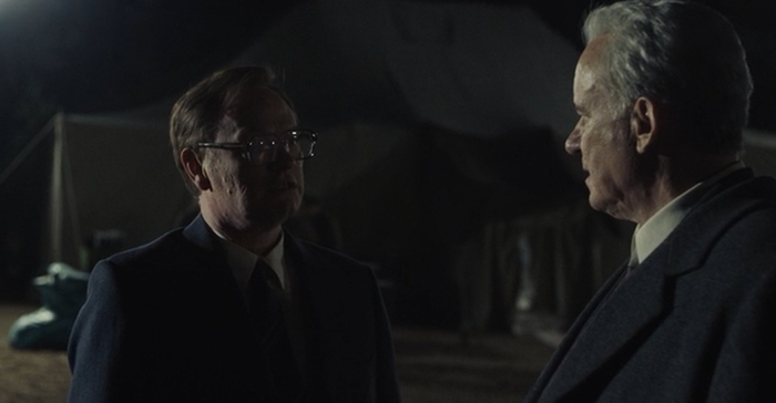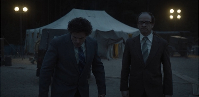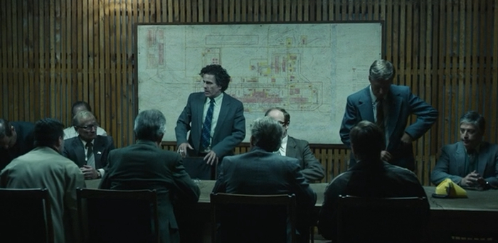 Ну а в сериале Легасова приглашают в зал заседаний, где сидят Горбачев, Щербина и другие члены правительства. Щербина в развязанной манере докладывает, что ситуация на Чернобыльской АЭС под контролем, военные и гражданские патрули оцепили местность, и генерал полковник Пикалов получил назначение на АЭС.