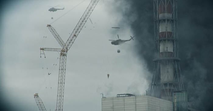 Первый вертолёт, залетав непосредственно в зону пожара, вскоре падает от радиоактивного излучения. Вертолет в Чернобыле упал, но это было не в первые дни после аварии, а уже позднее, почти через пять месяцев. Да и не сбрасывал он в реактор мешки с песком — поскольку это были уже ликвидаторы из второго потока. В сериале вертолет упал, попав в активную зону, в реальности же он рухнул, зацепившись лопастями за трос строительного крана — из-за яркого солнца пилот просто не увидел препятствие.