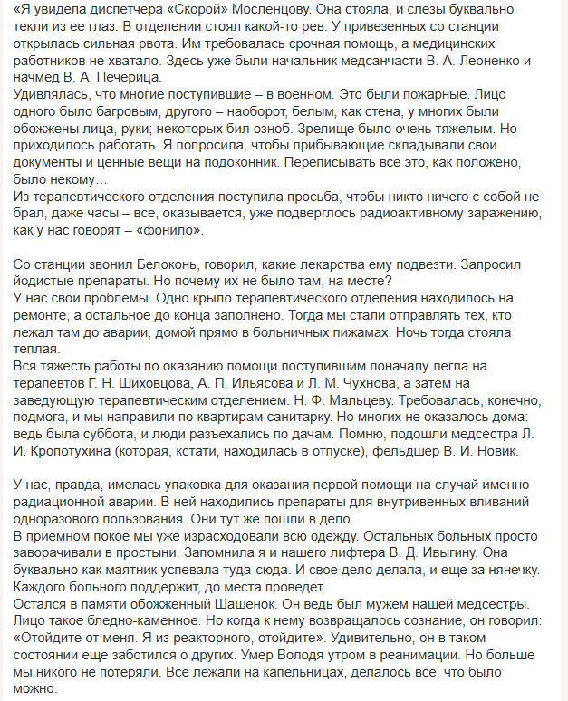 - 6-я клиническая больница показана очень скудно, а ведь это была головная клиника в 3-м управлении Минздрава, которое обслуживало работников станций. И жена пожарного Василия Игнатенко Людмила, конечно, не жила в ней круглосуточно. Жен селили недалеко от клиники на Живописной улице в Доме медработника, в общежитии. Кстати, был драматичный сюжет не только в жизни пожарных, но и станционников, которых в больнице было куда больше. Просто авторы сериала использовали монолог Игнатенко из книги Алексиевич.