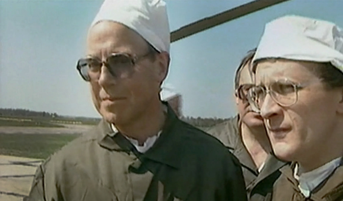 Валерий Легасов – академик, заместитель директор Курчатовского НИИ и один из непосредственных участников событий в Чернобыле - предлагает тушить пожар в реакторной зоне, сбрасывая туда мешки с бором и доломитовым песком. На следующее утро он и председатель Совета министров СССР Борис Щербина, глава правительственной комиссии по ликвидации последствий аварии на ЧАЭС, наблюдает за тем, как в столб черного дыма, поднимающийся из разрушенного энергоблока, заходит вертолет. Вскоре связь с экипажем пропадает. Еще через несколько секунд вертолет, оставшийся без управления, задевает трубу и падает, ломая лопасти.