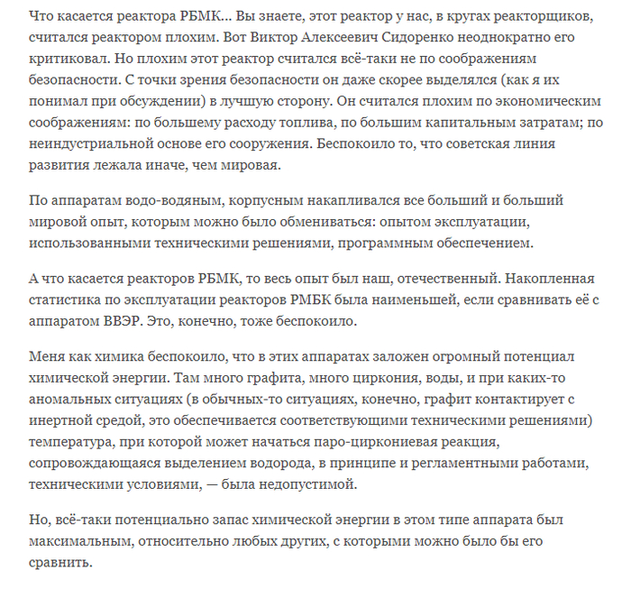«В самом ИАЭ с 1965 г. были сотрудники И.Ф. Жежерун, В.П. Волков, В.Л. Иванов, указывавшие на ядерную опасность предлагавшейся и впоследствие осуществлённой конструкции РБМК. Их действия успешно блокировались академиком А.П. Александровым, а докладные клались «под сукно». Пуск и эксплуатация первого блока Ленинградской АЭС в 1975 г. уже на практике подтвердили ядерную опасность реакторов РБМК. Если до пуска первого блока ЛАЭС нарушения Правил в проекте РБМК можно считать ошибками, то после пуска и их экспериментального подтверждения опытом эксплуатации первого блока ЛАЭС и последующего тиражирования во всех вновь вводимых блоках РБМК их можно назвать только преступлением».
