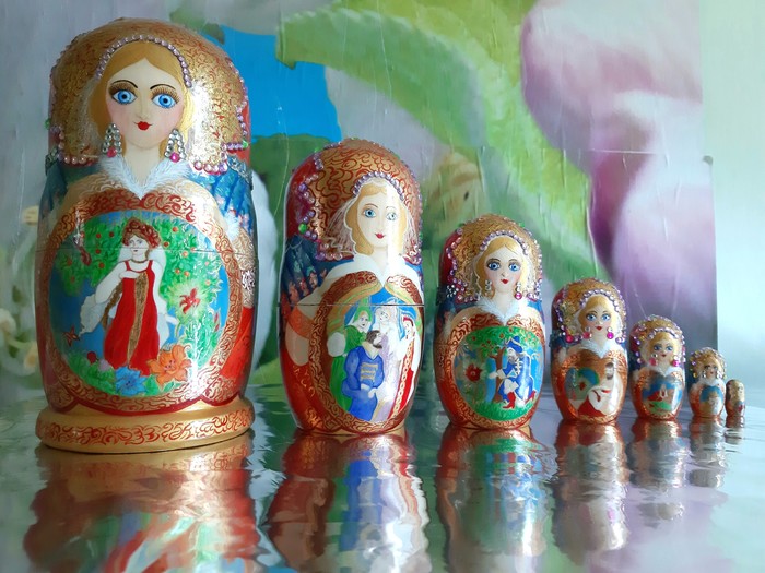 Я посмотрела цены в магазинах, и попробовала сама расписать матрешку. Купила заготовку - семёрочку, все необходимые материалы - краски, паталь и расписала. Фото моя семёрочка матрёшка.