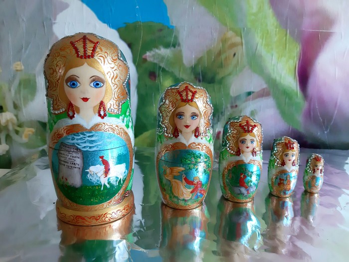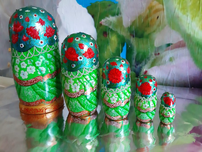 Но продать у меня её не получилось. В этом деле есть определённые стандарты. Красный цвет, форма рисунков классическая и определенные цветы и ягоды на платке. А мне хотелось творческого подхода. Я сделала свои матрешки такими, как мне нравилось. Во второй матрешке ошибкой было использование стразов, цвет, но в принципе она уже годилась на продажу. В одном магазине мне предложили за мою пятерочку 800 рублей. Я не отдала. Я потратила на материалы 3 тыс.р. плюс кучу времени и считала, что авторская работа должна стоить больше. В другом магазине взяли под реализацию, но не успели продать. Я её забрала, чтоб кому-то другому показать, а тот человек не купил. Сказалось отсутствие смартфона. Показать можно было просто фото. Я видела, что практического толка во всем этом нет. Работать только на материалы, это не разумно. Хоть мне и нравится творческая работа, но это может идти как подработка в свободное время, не более того. Со своим магазинчиком, я уже этот квест прошла. Я оставила свои матрёшки для наших детей, для моих племянников, чтобы они приходя к нам играли. У нас в детстве такой игрушки не было, а она имеет некий скрытый, национальный смысл. Я думаю, имея постоянную работу и делая матрёшки в свободное время, где-то пятый набор у меня получился бы хорошо. Но не на Кавказе их продавать, не тот менталитет. Здесь свои сувениры.