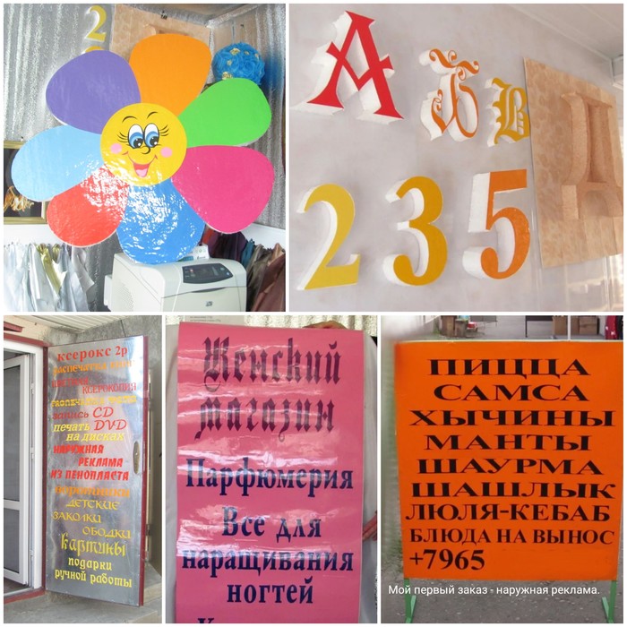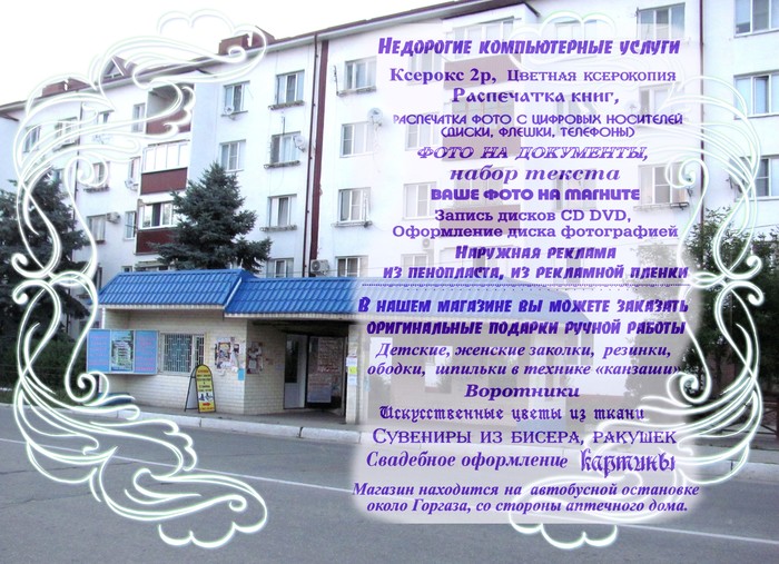 Свою рекламу я тоже оформила сама. Зря я что ли училась тексты оформлять? Получился у меня магазинчик - подарки ручной работы и компьютерные услуги, ксерокс, фотопечать. Ещё я занималась наружной рекламой, могла бы вырезать буквы из пенопласта, но таких заказов не было. Кроме своей рекламы, я успела выполнить три заказа. Фото реклама на двери, это моё первое помещение для магазина.