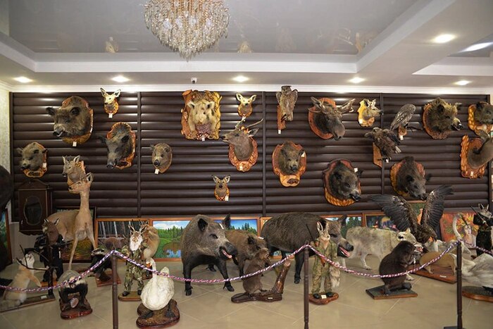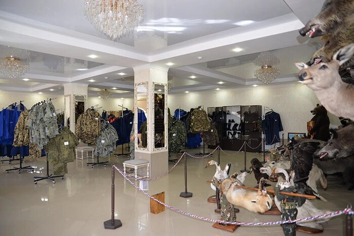 В магазине также можно найти спецодежду, камуфляжные костюмы, мангалы, наборы для каминов, мебель, чучела животных и продукты питания.