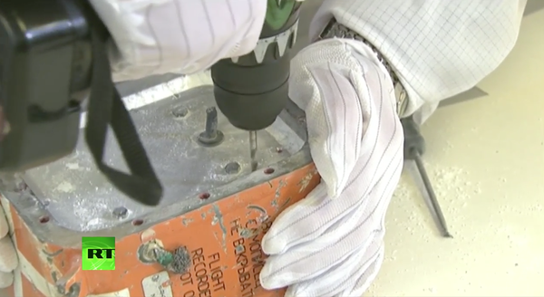 Судя по всему впервые в мире в прямом эфире происходит вскрытие бортового самописца потерпевшего крушение самолета.