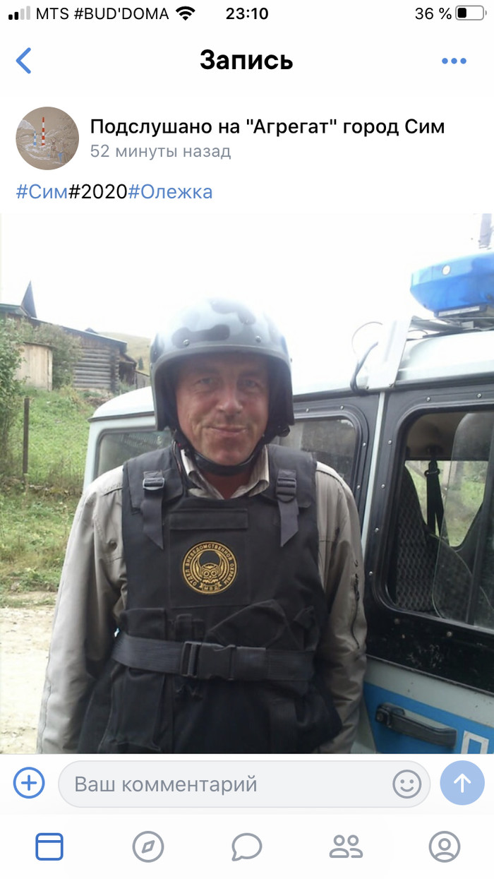 В городе Сим,группа социальной сети ВК градоообразуещего предприятия «Подслушано Агрегат»!Разместила на своей стене фотографию,известной личности,в этом маленьком городке,психически не здорового человека!На ней он запечатлён в облачении сотрудника Росгвардии на фоне служебного автомобиля!Что хотели они сказать ,этой публикацией,мне непонятно!