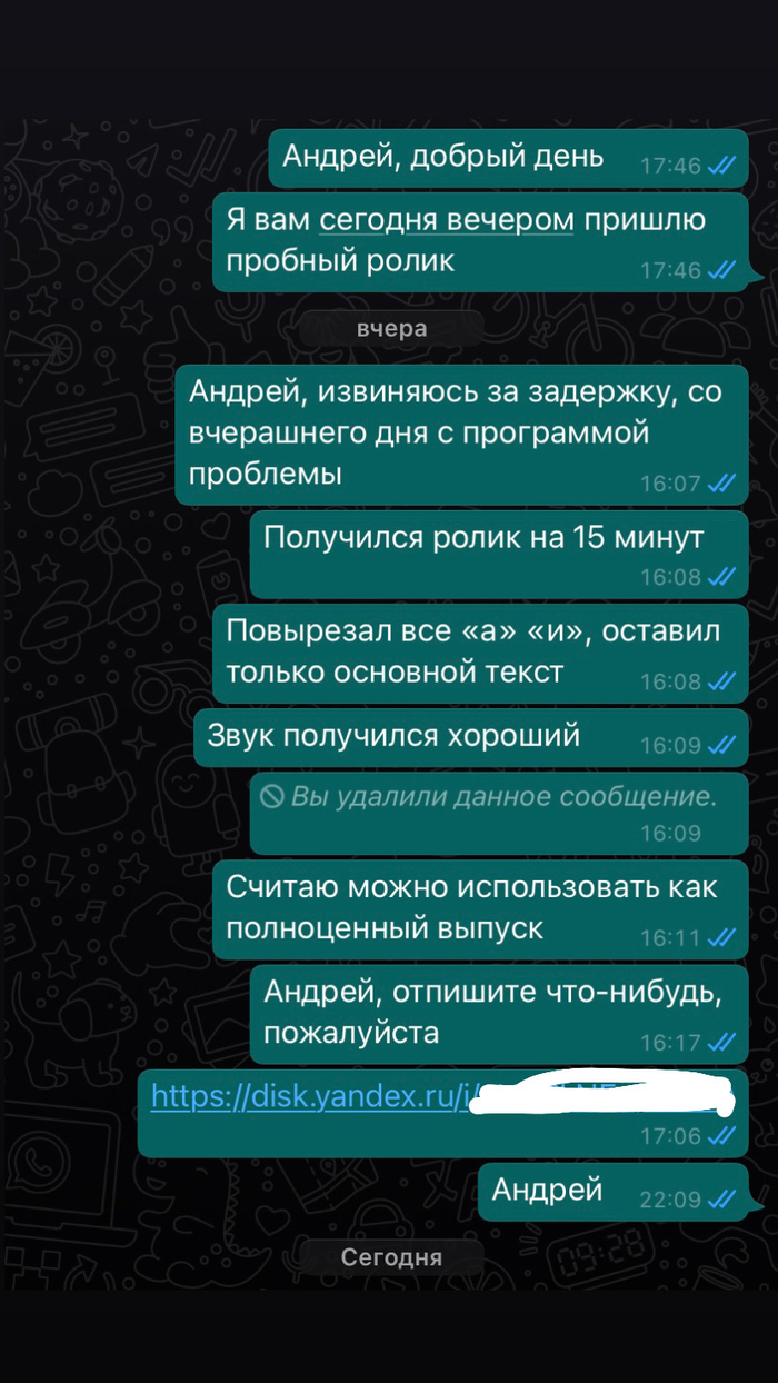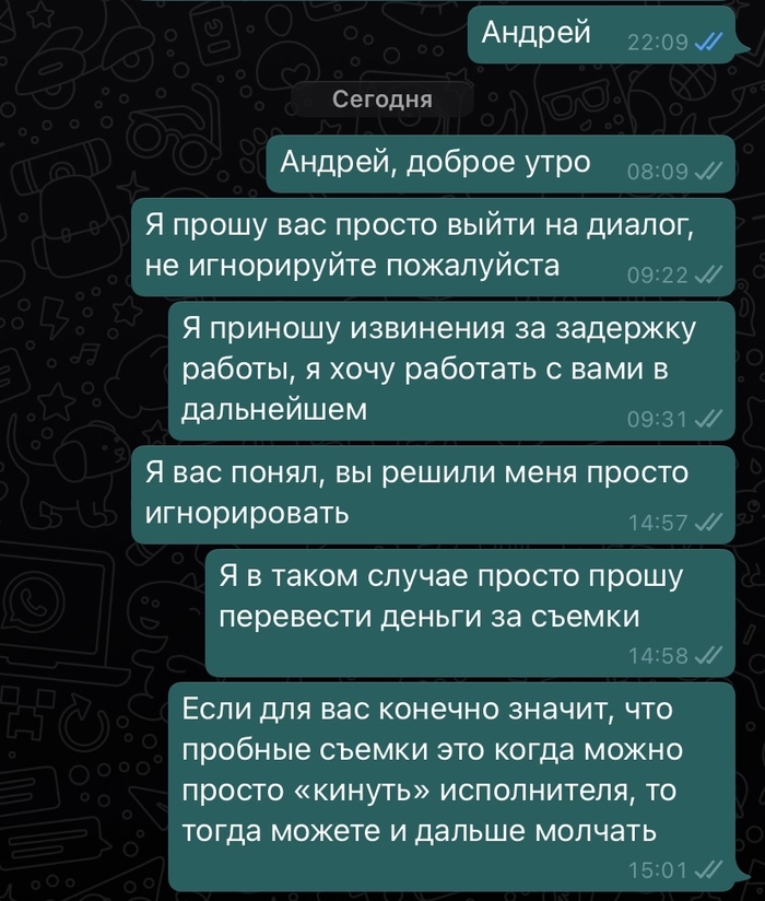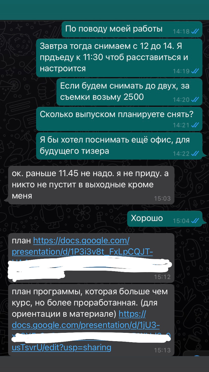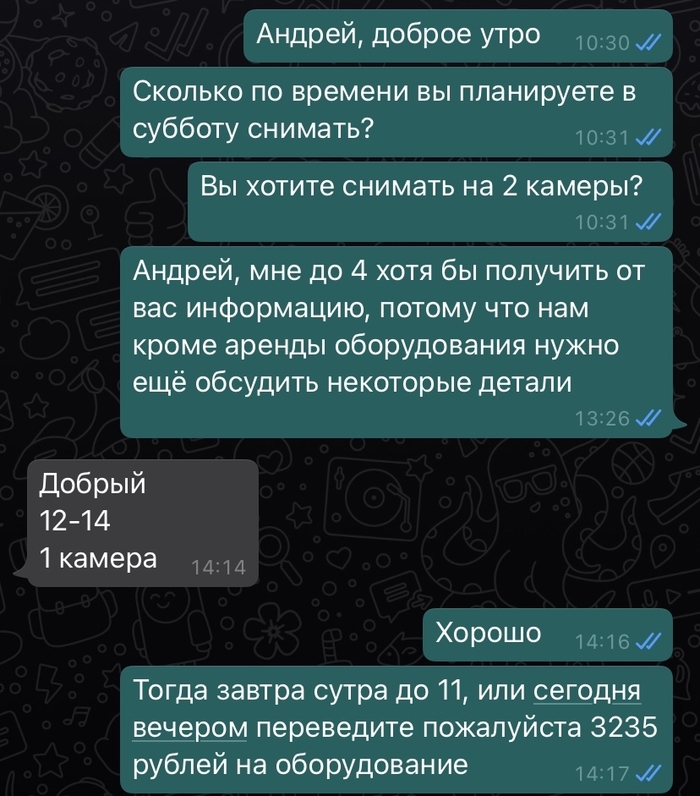 Съемки заняли часа 3. После съёмок я ещё раз напомнил об оплате работы, попросил чтоб перевели в этот же день, он кивнул и мы разъехались.
