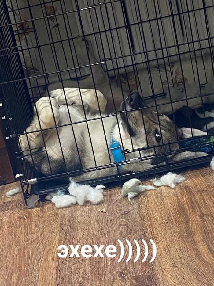 Что я могу сказать? Хью был воспитан в вольере, и, чтобы ему было комфортнее, было решено купить такой же. Однако вскоре выяснилось, что наш щенок боится одиночества. Как только я выходил в другую комнату, начинались настоящие концерты — скулеж, вой и попытки вынести дверь клетки. Это был настоящий «драматический спектакль».