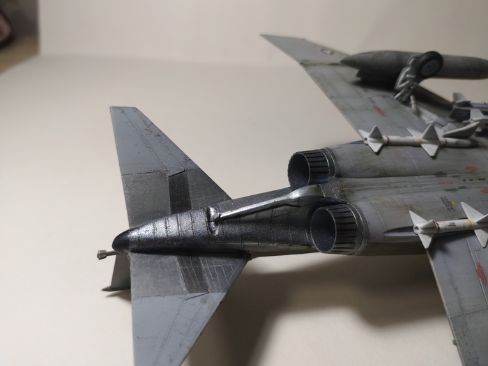 Сборка не доставила проблем. Понравилось качество декалей и достаточное количество технических надписей. Окрашивал аэрографом спиртовыми Tamiya и Gunze. Цвета мешал на глаз, готовых не было. В конце попачкал немного маслом и пигментами. В общем, получился такой истребитель.
