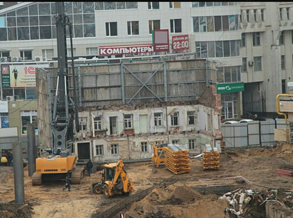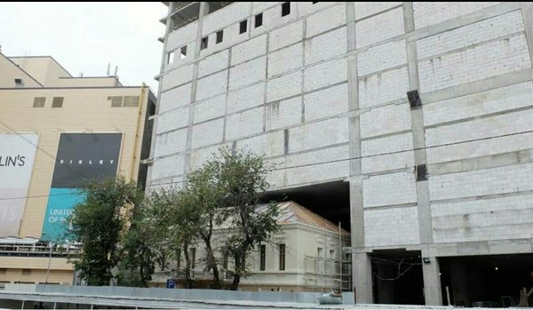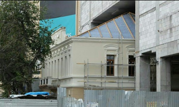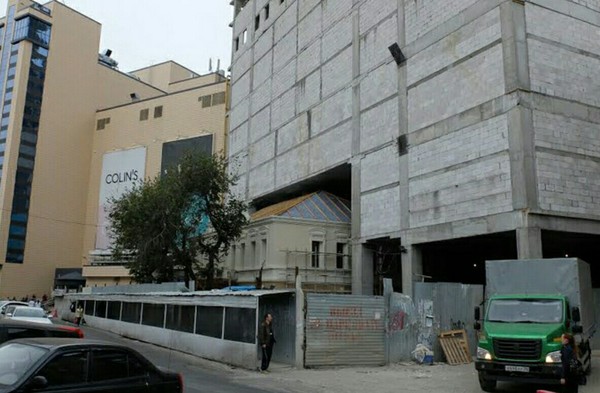 Очень странно, что не убрали дом полностью ( может все-таки мэрия по шапке дала?), но зато построили, что хотели прямо над остатками фасада. Теперь памятник выглядит как-то так: