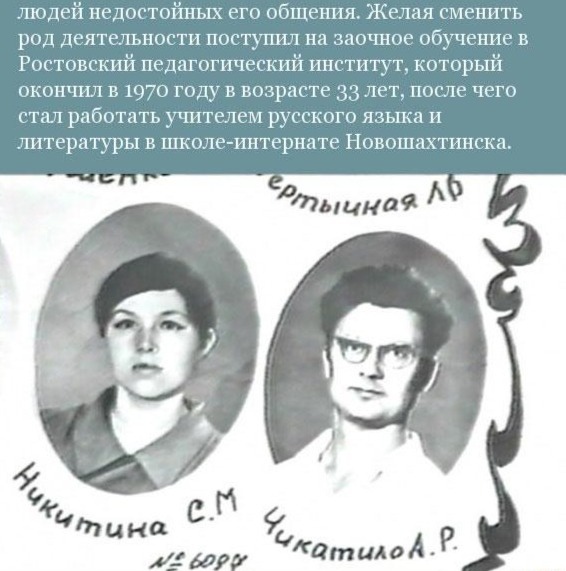 Сразу после свадьбы Чикатило поступил на заочное отделение филологического факультета Ростовского университета, который окончил в 1970 году по специальности «Русский язык и литература»[3]Двое детейВ апреле 1965 года с согласия районного комитета партии Чикатило был назначен на должность председателя районного комитета физической культуры и спортаВ 1970 году заочно окончил Университет марксизма-ленинизма при педагогическом институте[27].