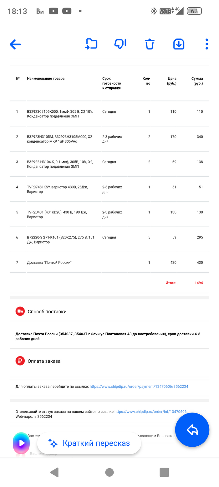 Понадобились мне радиодетали, точнее радиодеталь, варистор. Я решил что к варистору нужен запас и положил в корзину больше, выбрал доставку через Почту России, адрес указал в Сочи и произвёл оплату.
