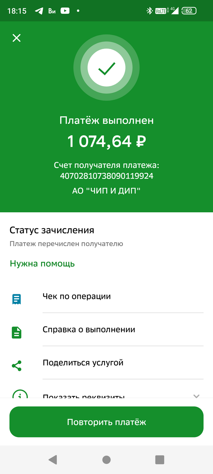 Как выглядит успешная транзакция в магазине Чип и Дип у терминала Сбербанк для карты Т-Банка