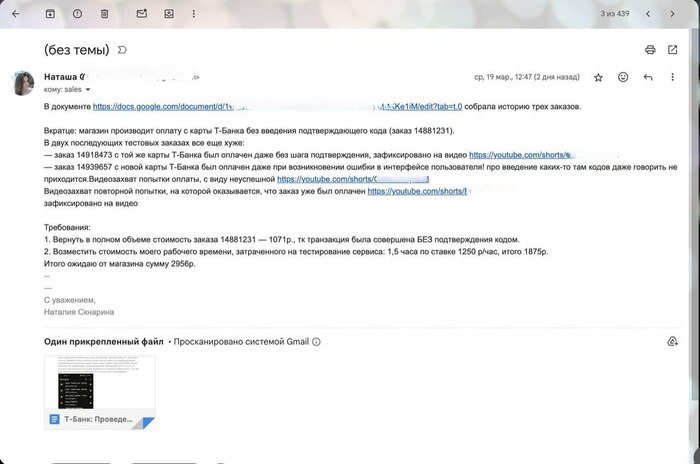 По результатам своего независимого тестирования собираю все вещдоки в файлик и отправляю его в Т-Банк и магазин. Ссылку на сам файлик и ссылки на видео из него не публикую, тк на скриншотах и видео не закрыты чувствительные данные.