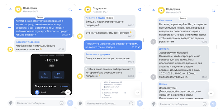Шок сменяется возмущением, звоню в магазин и пишу в поддержку Т-Банка. Требование для всех у меня одно — вернуть мне мои кровные 1071 рубль, ни больше, ни меньше.