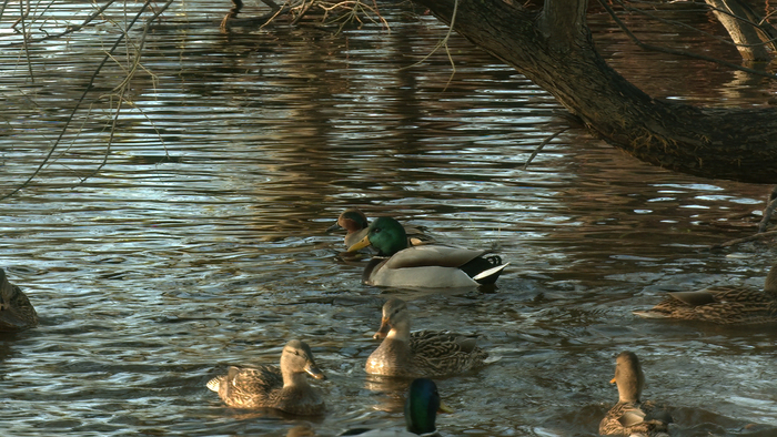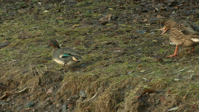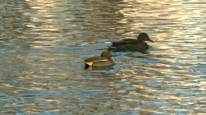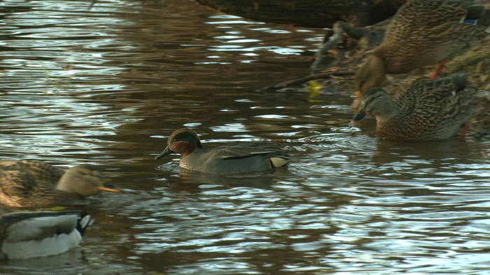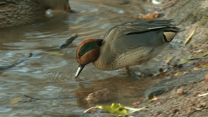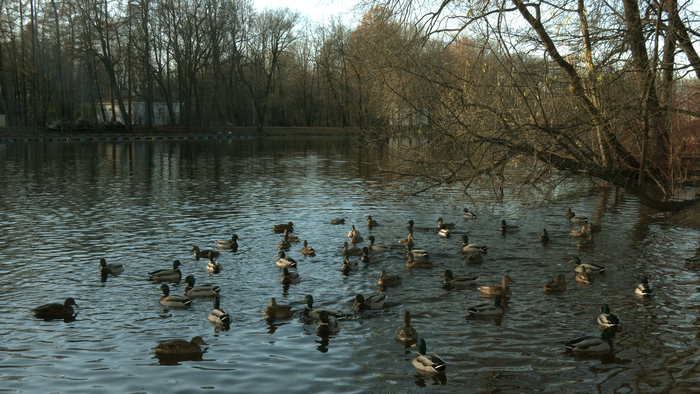 Это самая меленькая наша речная утка. Полное её название – чирок-свистунок. Судя по нарядному окрасу, в гости к нам пожаловал селезень – так называются самцы уток. Этого эффектного кавалера ни с кем не спутаешь. Его красно-коричневая голова расцвечена широкой зеленой полосой, проходящей через глаз. Красавец! Какая же самка сможет устоять перед ним? А свистунком его прозвали за звонкий свист, которым этот нарядный жених привлекает к себе будущую невесту. Трудно поверить, что этот звук издаёт хоть и маленькая, но все же утка, в то время как подруги отвечают своим кавалерам самым обычным кряканием! В норме свист самца – это весенняя брачная песня, тем удивительнее услышать её сейчас, поздней осенью! Похоже, наш гость что-то насвистывет самкам крякв. Крайне редко эта утка встречается и в Петербурге, а этот красавец, скорее всего, залетел на Елагин остров ненадолго – чтобы отдохнуть по дороге на юг.