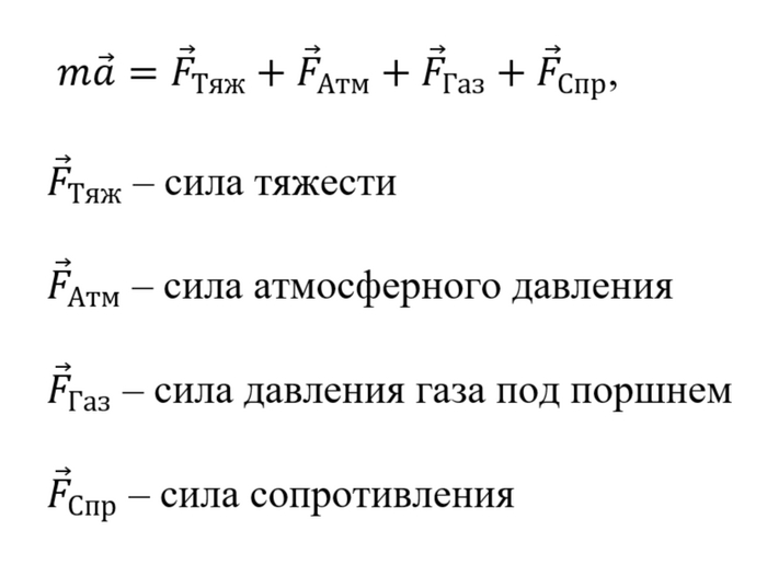 Теперь разберемся с силой, действующей на поршень (ну вернее силами, F в уравнении заменится на сумму сил). Поршень находится в поле тяжести, значит на него будет действовать сила тяжести. Также есть внешнее атмосферное давление, которое будет вдавливать поршень. С другой стороны, под поршнем же ведь газ, который тоже будет с какой-то силой его выталкивать. А еще при его движении будет возникать сопротивление. Вот эти 4 силы и будут вызвать движение поршня: