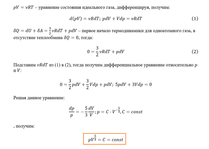 Вернемся к нашим барашкам. В силе тяжести неизвестных нет, она нам сразу известна. В силе сопротивления есть скорость, но скорость определяется из самой диффуры (искомая функция в дифференциальном уравнении), поэтому ее мы оставляем так. С атмосферным давлением тоже все предельно просто: мы всегда знаем силу его давления, давление и площадь то нам даны) А вот с давлением газа в сосуде сейчас будем разбираться Что приходит в голову в первую очередь, когда мы пытаемся описать газ? Уравнение идеального газа есестно. Поскольку цифры здесь не какие-то экстремальные, то оно будет вполне рабочим, поэтому им и будем пользоваться. Запишем его пока в уме) По условию, у нас еще газ теплоизолирован. Хм... Понятно, что нужно еще какое-то уравнение, которое будет описывать газ без теплообмена. А какое уравнение содержит в себе подводимое тепло? - Первое начало термодинамики, конечно. Из этих двух уравнений мы можем получить третье, уравнение адиабатного (без теплообмена то есть) процесса. Вот вывод, если кому интересно, вообще можно это уравнение и без вывода использовать: