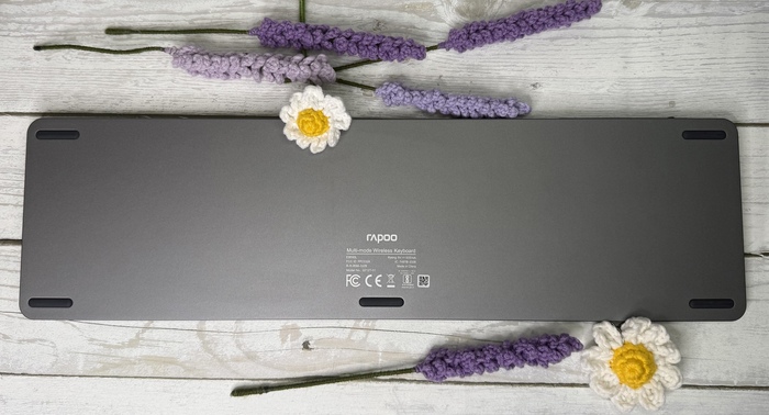 На задней стороне, помимо технической информации, находятся 5 прорезиненных ножек. А вот откидных пластиковых ножек для изменения угла наклона клавиатуры здесь не предусмотрено.