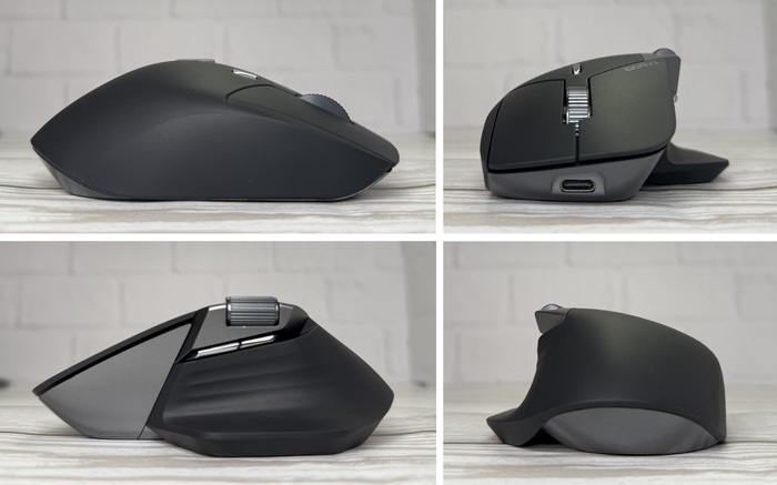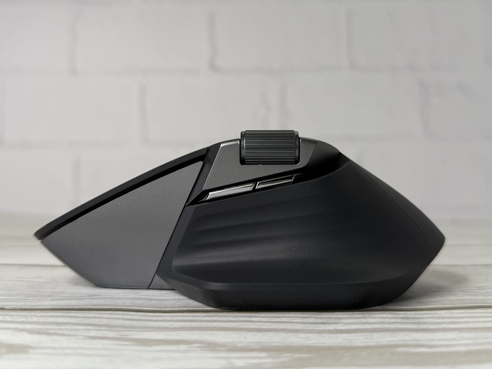 На дальней, т. е. самой высокой, грани располагаются гнездо для зарядки (Type — C) и трехпозиционный переключатель ( Соединение через USB-ресивер \ Выключение \ Соединение через Bluetooth). На сером пластике с черной вставкой смотрится органично.