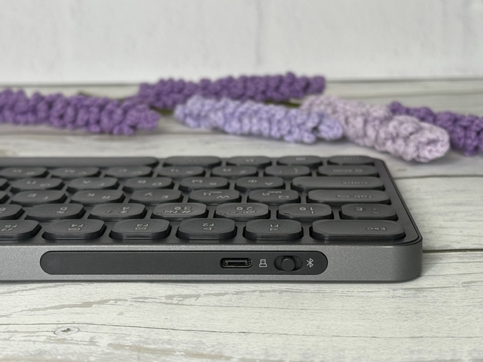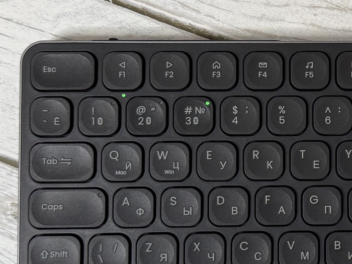 На клавиатуре есть 6 индикаторов. Находятся они на клавишах: Caps, NumLock, 3 номера подключения по Bluetooth — каналу(верхний левый угол, кнопки «1″,» 2″, «3») и индикатор зарядки(тот же левый верхний угол, под «F1»).