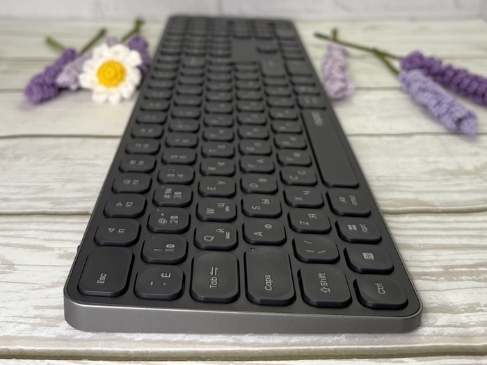 Тонкие края по всем сторонам клавиатуры делают ее элегантно-миниатюрной, хотя это 100% полноразмерка. Габариты устройства: 115 х 421 мм.