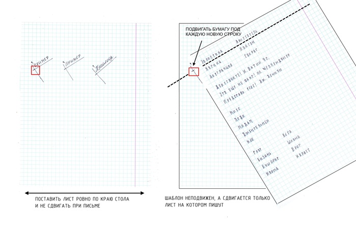1. На листе в клеточку. Можно сделать под любой шрифт или почерк.